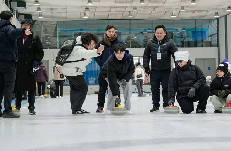 参访首站,营员们来到北京体育大学,国家队训练基地的专业设施让大家驻足惊叹。作为集训练、科研于一体的世界级体育基地,这里既彰显着中国体育的硬核实力,也承载着几代体育人的奋斗初心。在校史馆内,营员们聆听了北体大与中国体育事业同向同行的辉煌历程。冰壶馆中,专业教练细致拆解投壶、擦冰要领,穿插讲述冰壶运动的起源与“精准、协作、坚韧”的项目精神。营员们分组协作,在冰面的摩擦声与队友的欢呼声中反复调整姿势、精准投掷,冰冷的冰面俨然化作温暖的交流场域。