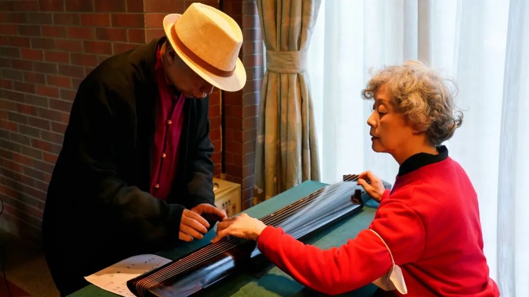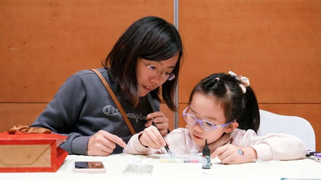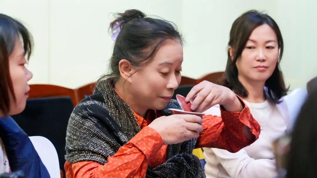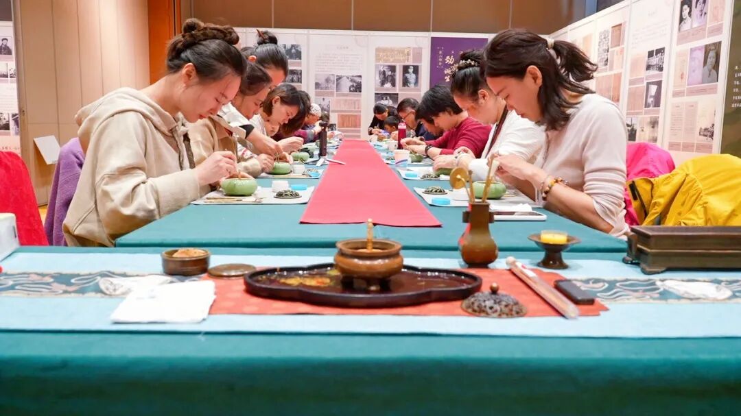 “光看不够,得亲手试试才过瘾!”“国风体验,浸润人心”环节里,七大体验区挤满了台胞。青年台胞围在青花瓷画DIY桌前,用瓷片拼凑着不同的形状,不时向非遗老师请教“如何让线条更流畅”;女台胞们围坐在茶席旁,听茶艺师讲冲泡手法,轻嗅茶香、细品茶味,还交流着“家乡阿嬷泡茶的习惯”;台胞家庭专区里,孩子们在父母指导下粘贴螺钿碎片,稚嫩的小手虽不熟练,却格外认真;老台胞们则跟着老师拨弄古琴琴弦,或是随着口令练起八段锦,动作舒缓,神情专注。